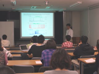 | プログレス・レポートと論文紹介をやっています。実験データをディスカッションし、研究の方針を決めていきます。時々講演などもやります。 | 鍋倉研と重本研の合同で論文紹介を行っています。ハチノスを突いたようにディスカッションが飛び交います。論文を紹介する担当者は、ハチノスのように撃たれることもまれにありますが、愛情のこもったディスカッションで、研究者として議論ができるようになることを目指しています。 学会発表などのプレゼンや学位の発表にとても役に立ちます。論文に対する批判や批評も参考になります。 |