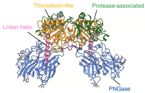 魚類に特有の卵巣特異的な糖鎖代謝機構を発見し、これを担う糖鎖修飾タンパク質PNGaseの構造をクライオ電顕単粒子解析で明らかにしました。